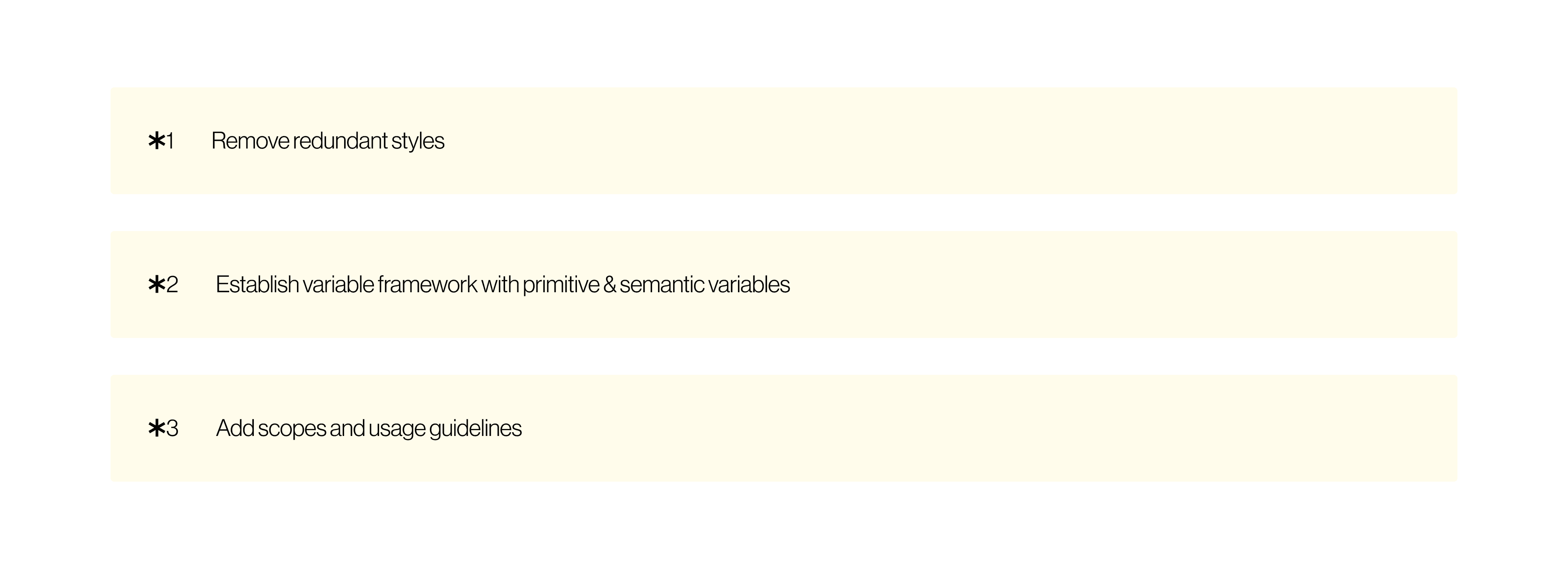The design system should clearly outline usage guidelines; making a decision for whether which component or styles to use is time-consuming